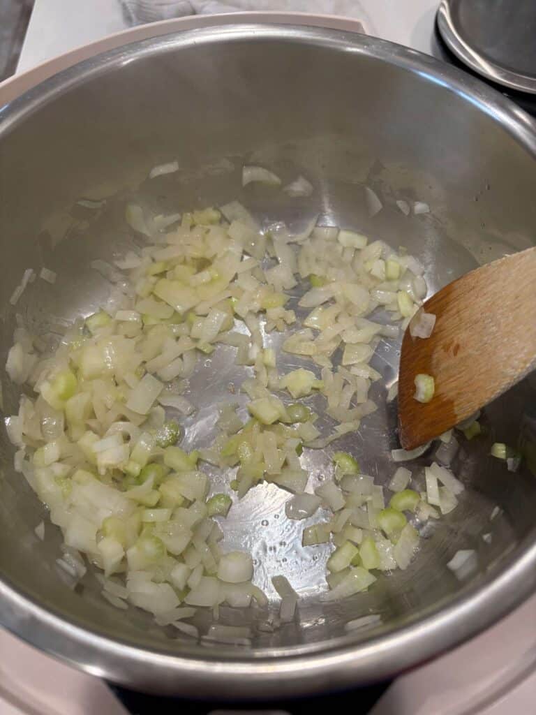 - Add the onion and celery into the pot with the 1 Tbsp of bacon fat. Sauté for 4 minutes.