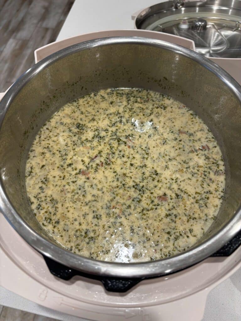 - Stir in the evaporated milk and warm through on the sauté setting. Taste test and add salt as needed.