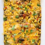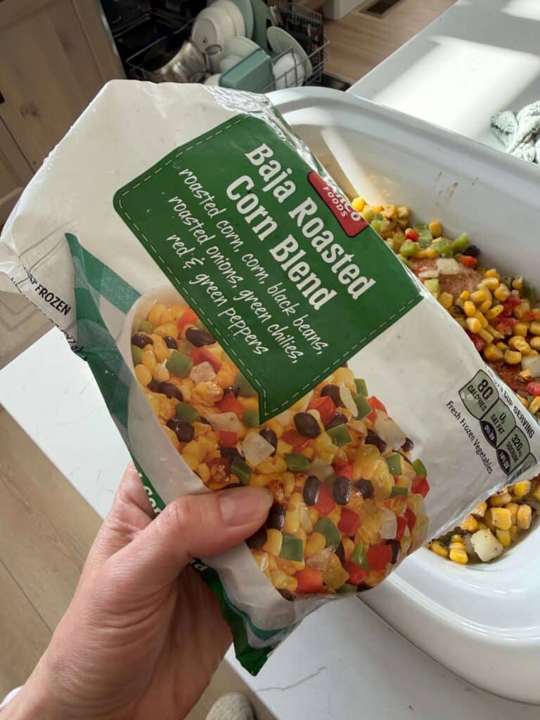 - Frozen Baja roasted corn blend–you can find this in the frozen veggie aisle. It’s roasted corn, black beans, red peppers, green peppers, roasted onions and green chilies.