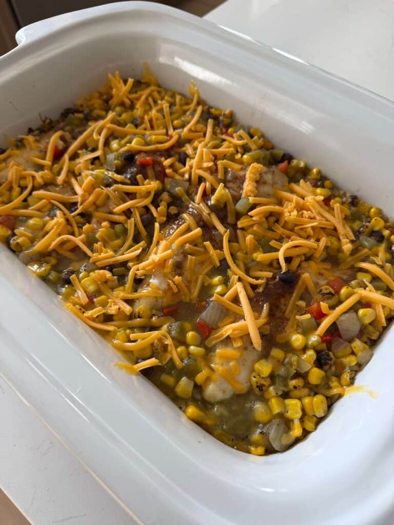 An easy one-pot slow cooker dinner made with tender chicken, rice, roasted corn, green enchilada sauce, lime juice and melty cheddar cheese.