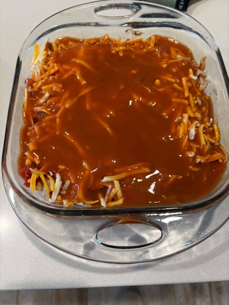 If you have cooked chicken on hand this dinner comes together really fast. Heat your oven to 350°F and grab a 9×9 inch baking dish. Layer in the chicken, then dump the Rotel evenly over it and sprinkle cheese on top. Whisk together the enchilada sauce and eggs in a bowl, then pour that mixture over everything. Bake for 30 minutes, then serve it scooped over crushed tortilla chips or rice for an easy, flavorful dinner.