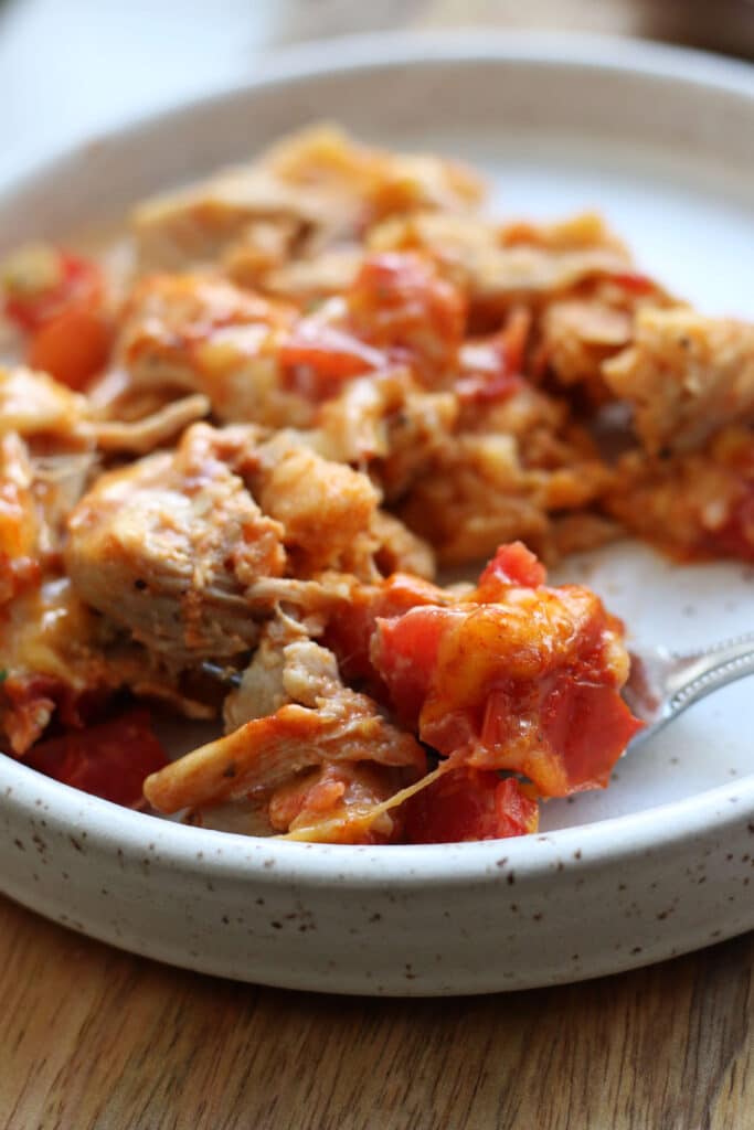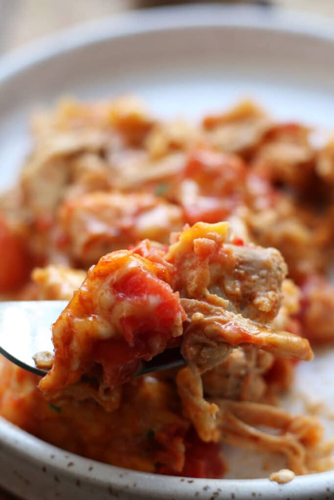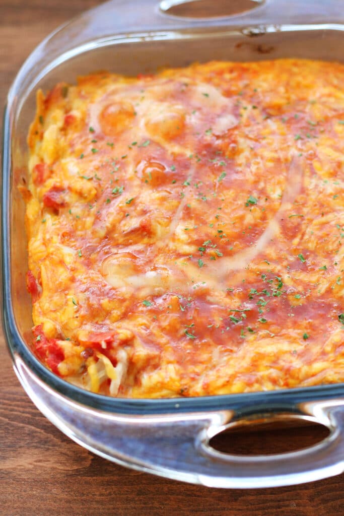 An easy baked chicken enchilada casserole with chicken, Rotel tomatoes and melty cheddar cheese that’s all bound together with a eggy enchilada sauce. Scoop over rice or crunchy tortilla chips!