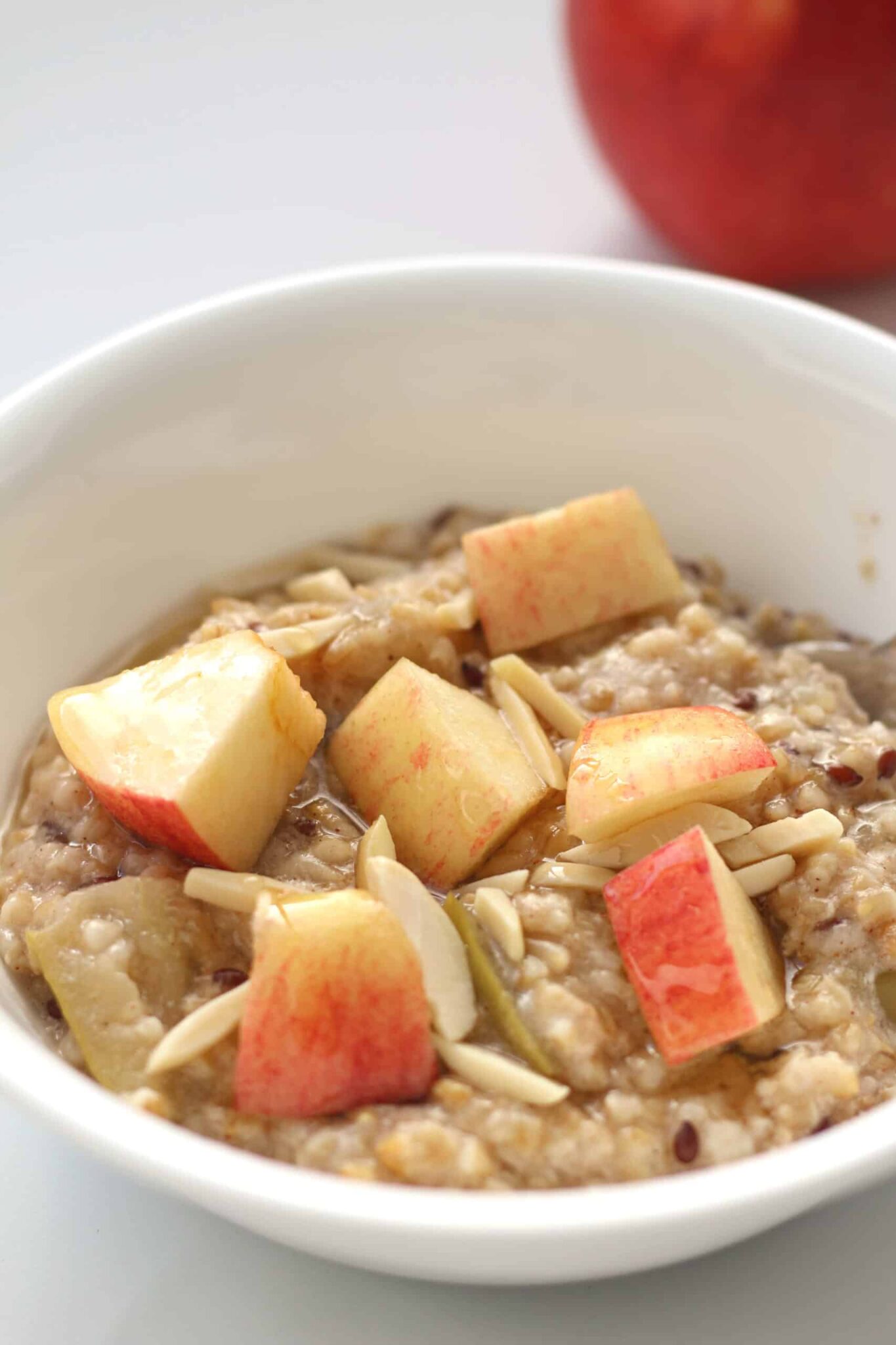 A hearty bowl of oatmeal with apple chunks, cinnamon and brown sugar. It’s cooked quickly in the Instant Pot with any type of oatmeal.