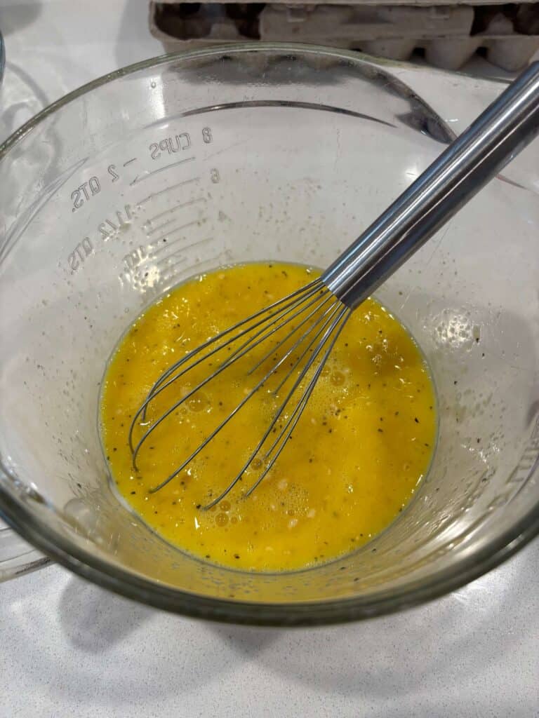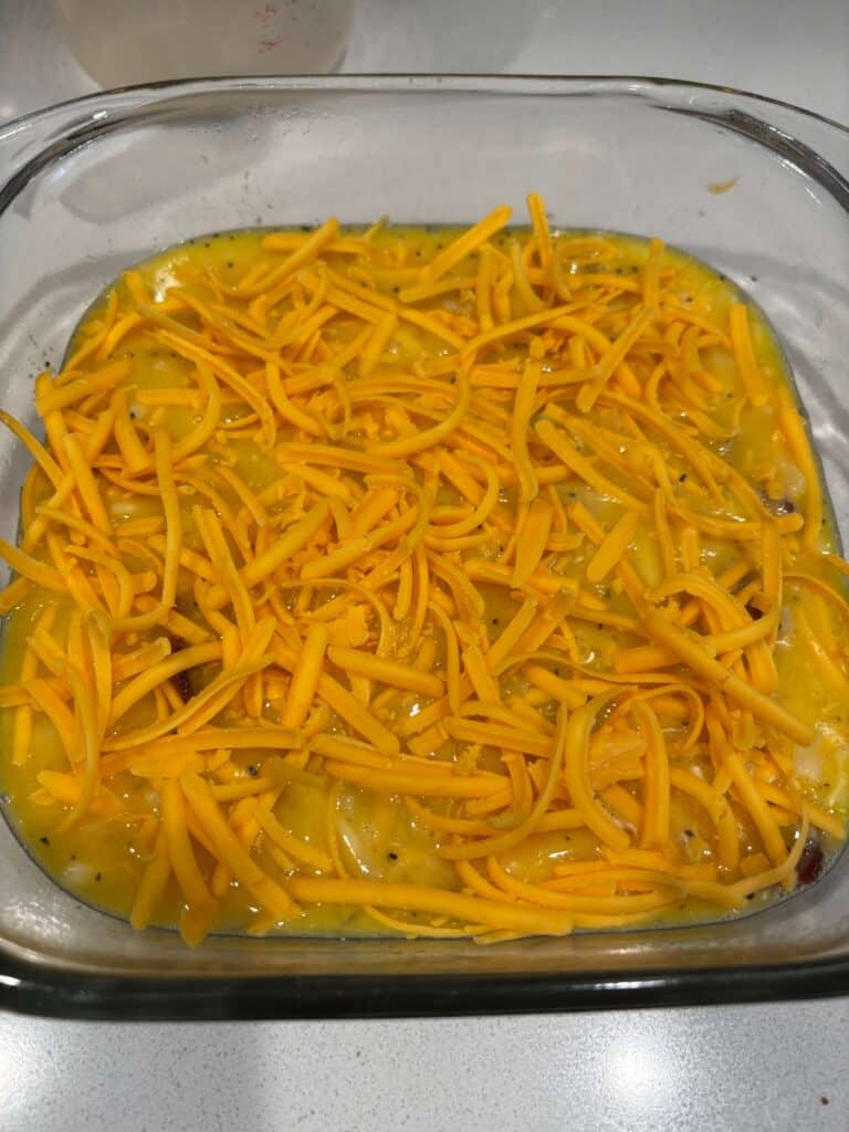 Spray a 8×8 inch baking dish with non-stick cooking spray. Pour the egg mixture into the pan. Sprinkle the remaining cheese on top.