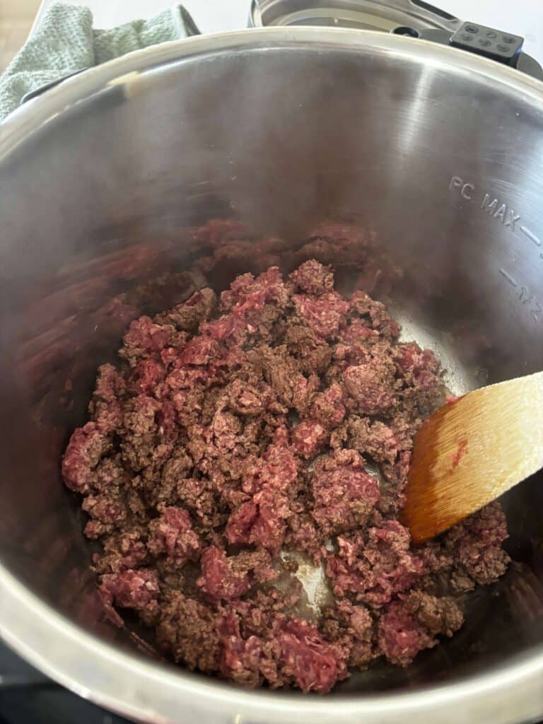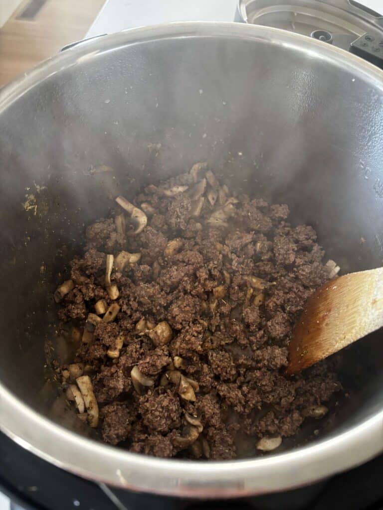 Turn Instant Pot to saute setting. When display says HOT add in the beef and break it up. Add in the mushrooms, onion powder, salt, pepper, garlic powder, rosemary and thyme. Brown for about 5 minutes.