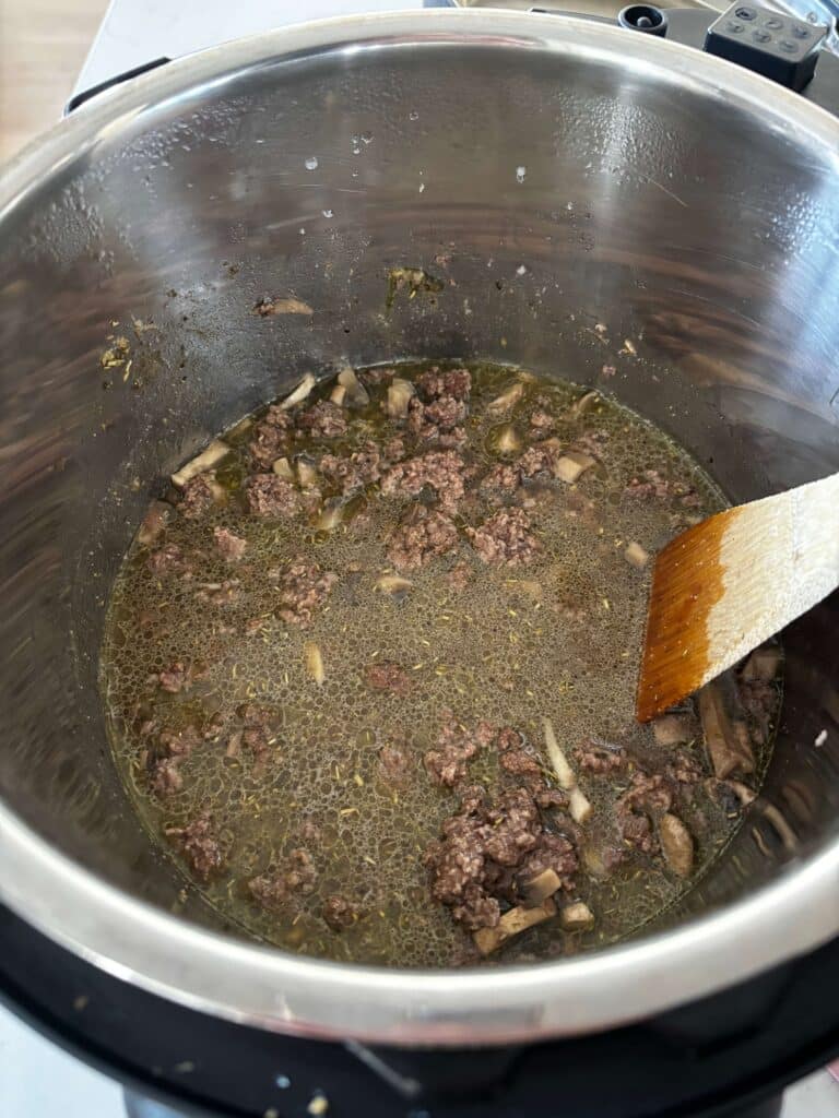 - Turn Instant Pot to saute setting. When display says HOT add in the beef and break it up. Add in the mushrooms, onion powder, salt, pepper, garlic powder, rosemary and thyme. Brown for about 5 minutes.