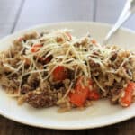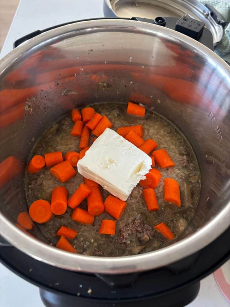An easy one-pot dinner made with seasoned ground beef, mushrooms, carrots and rice cooked together in the Instant Pot, then finished with cream cheese, cream, and a generous sprinkle of parmesan.