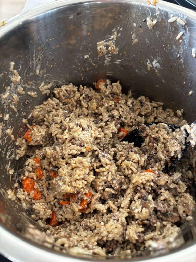 Cheesy Ground Beef and Rice Casserole—an easy one-pot dinner made with seasoned ground beef, mushrooms, carrots and rice cooked together in the Instant Pot, then finished with cream cheese, cream, and a generous sprinkle of parmesan.