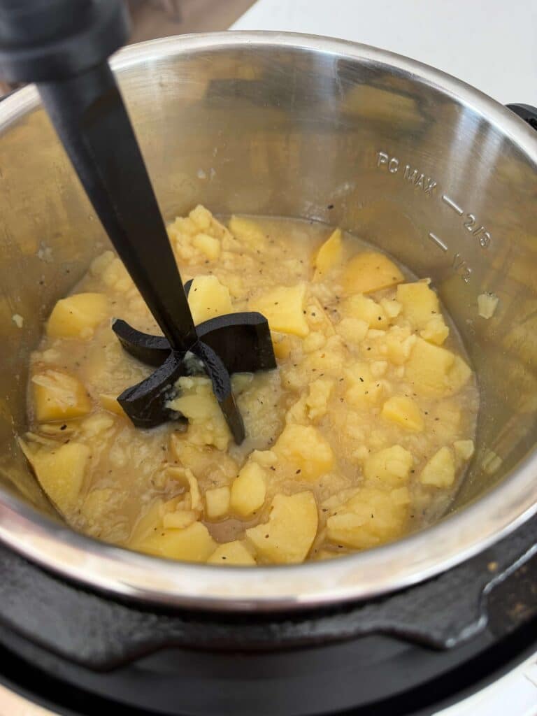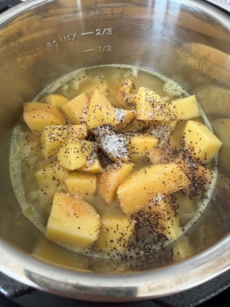 Add broth, onion, potatoes, garlic powder, salt and pepper to Instant Pot.