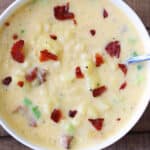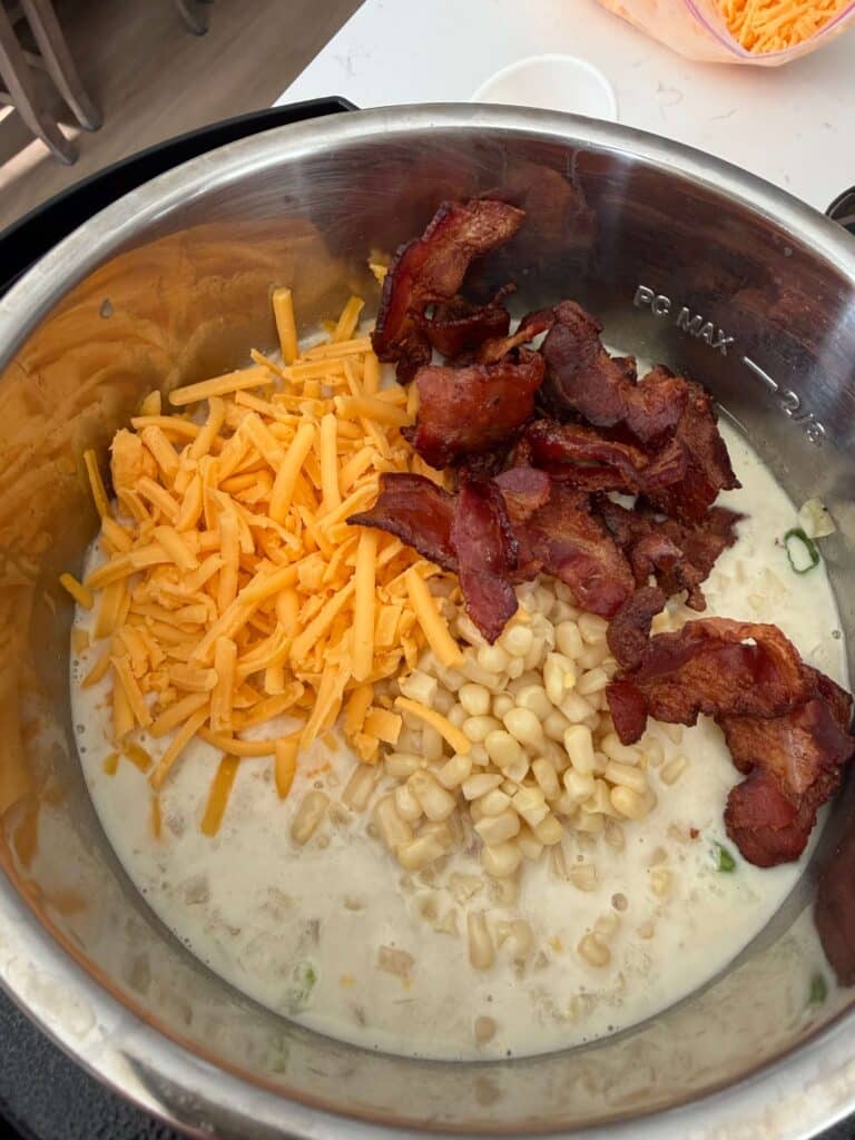 Instant Pot or slow cooker soup made with tender Yukon gold potatoes, smoky bacon, sweet shoepeg corn, and sharp cheddar for an easy dinner ready in under 30 minutes.