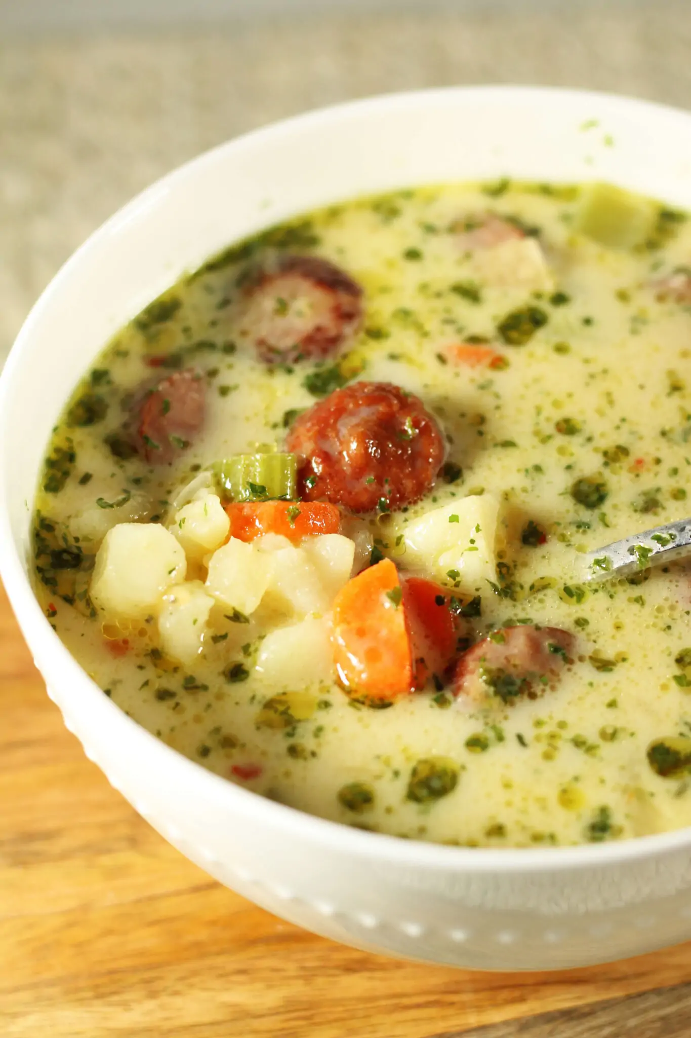 Tender potatoes, carrots, and chicken simmered in a savory broth, then finished with Dijon, herbs, spinach, and a splash of half-and-half and crispy bacon for a cozy, creamy soup made easy in the Instant Pot or slow cooker.