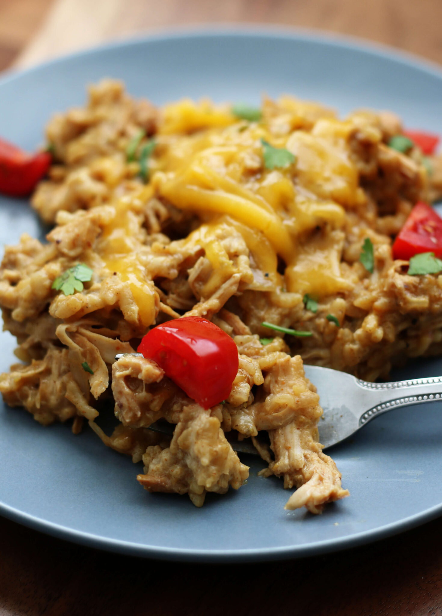 An easy and flavorful Instant Pot dish with tender chicken, creamy arborio rice and a punch of salsa verde and spices, all topped with melty cheddar cheese.