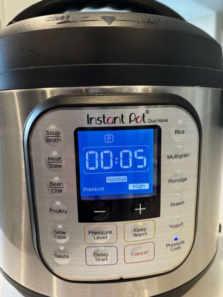 - Cover Instant Pot and secure the lid. Make sure valve is set to sealing. Set manual/pressure cook button to 5 minutes. When time is up let pot sit for 10 minutes and then move valve to venting. Remove the lid.
