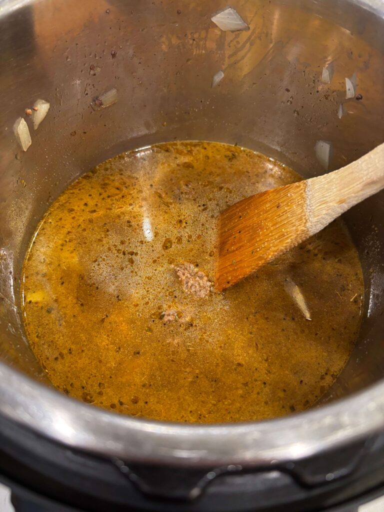 Pour in the broth and scrape bottom of pot so that nothing is sticking. Turn off Instant Pot.