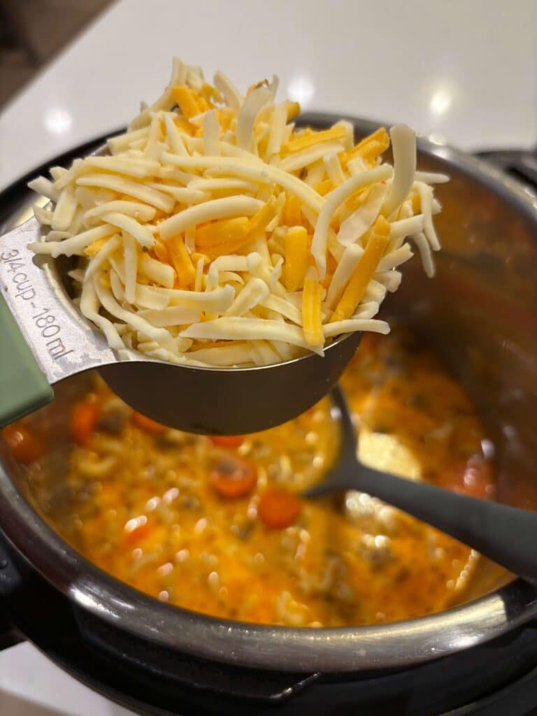 Browned ground beef, onions, carrots, tomato paste, and tender macaroni pressure cooked (or slow cooked) in savory beef broth, then finished with a splash of cream and melty cheddar-pepper jack for an ultra-comforting bowl.