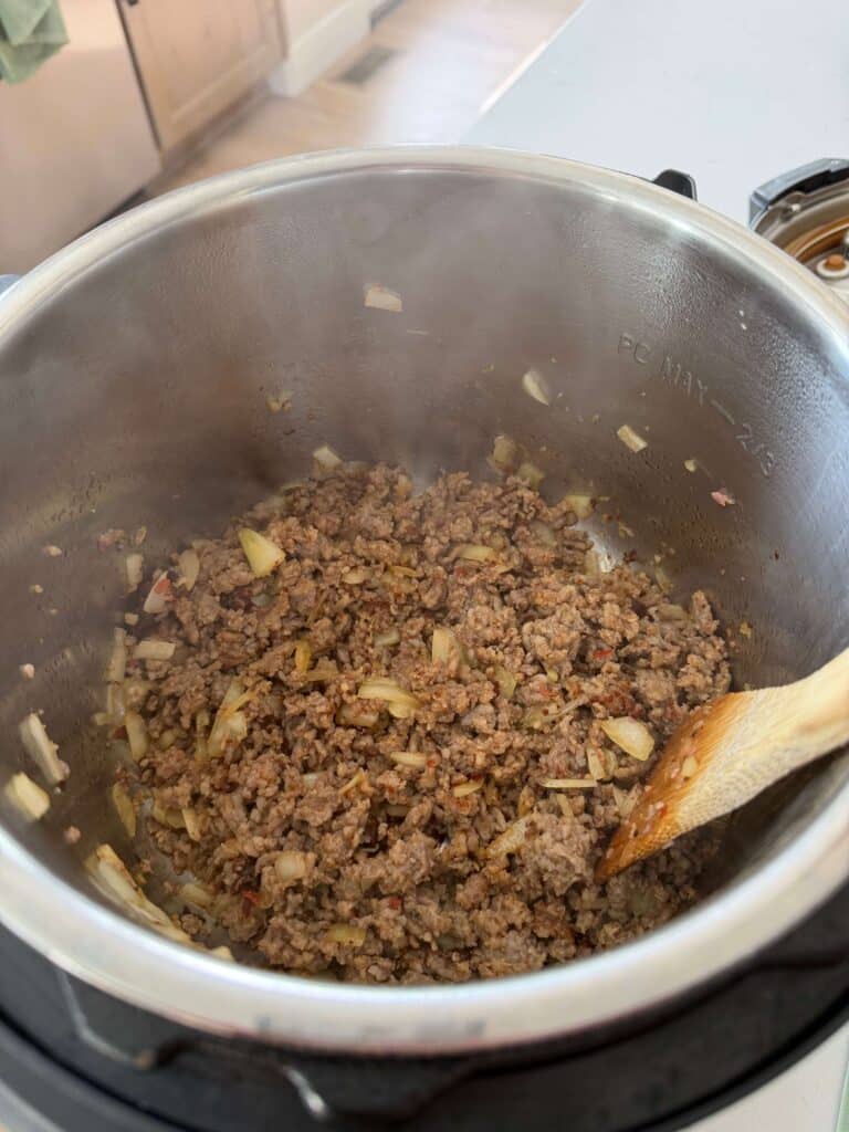 - Turn Instant Pot to sauté setting. When display says HOT add in the sausage and break it up. Add in the onions. Brown for 5 minutes. Drain off excess grease.