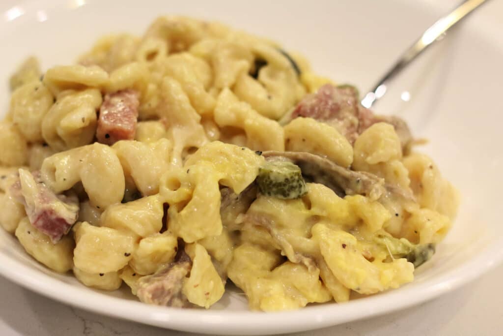 Everything you love about a Cuban sandwich! Tender pork, smoky ham, tangy pickles, mustard and melty cheese are tossed together in a creamy, comforting pasta made easy in the Instant Pot.