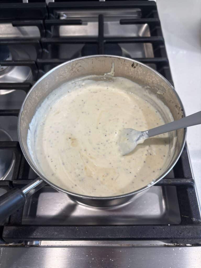 - Slowly whisk in the flour, a tablespoon at a time. Then slowly whisk in the milk. Stir in the bouillon, salt, pepper and garlic powder. Stir until thickened.