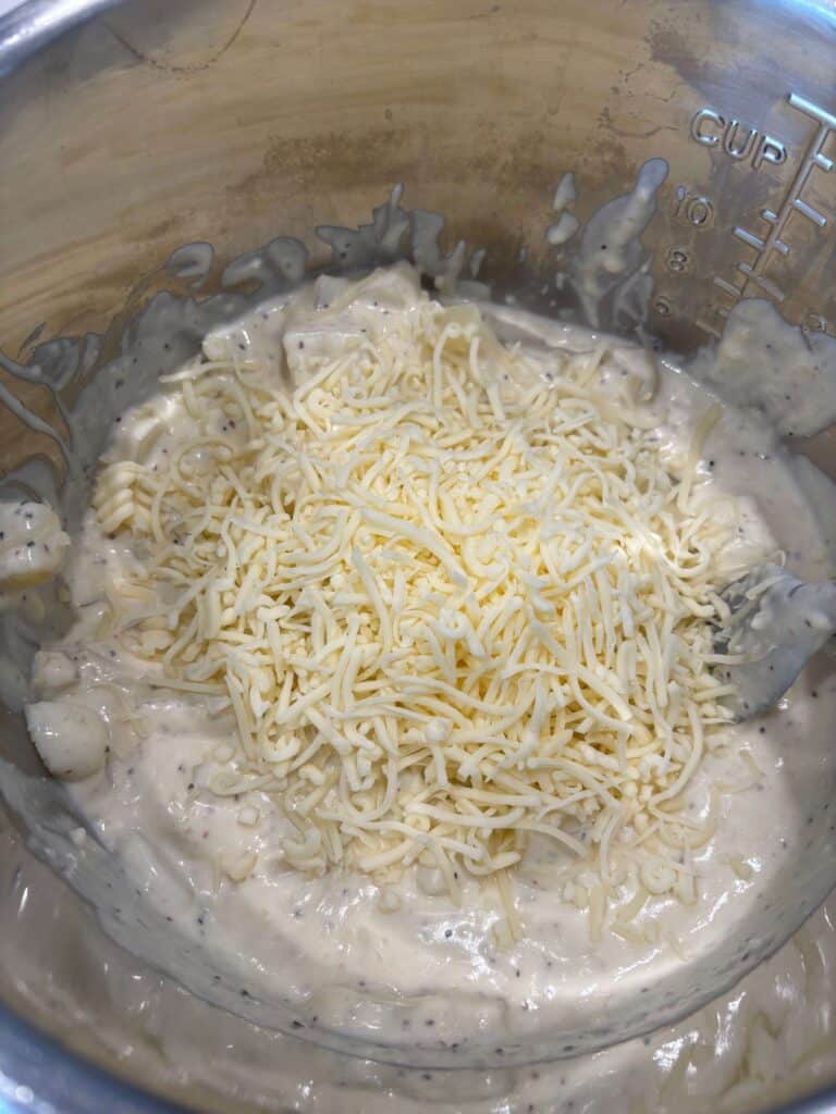 Once Instant Pot is done cooking the potatoes, move the valve to venting and remove lid of Instant Pot. Discard the water. Add potatoes into the Instant Pot and then fold in the sauce you made on the stove. Stir in the cheese until melted.