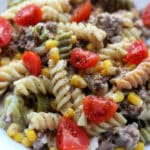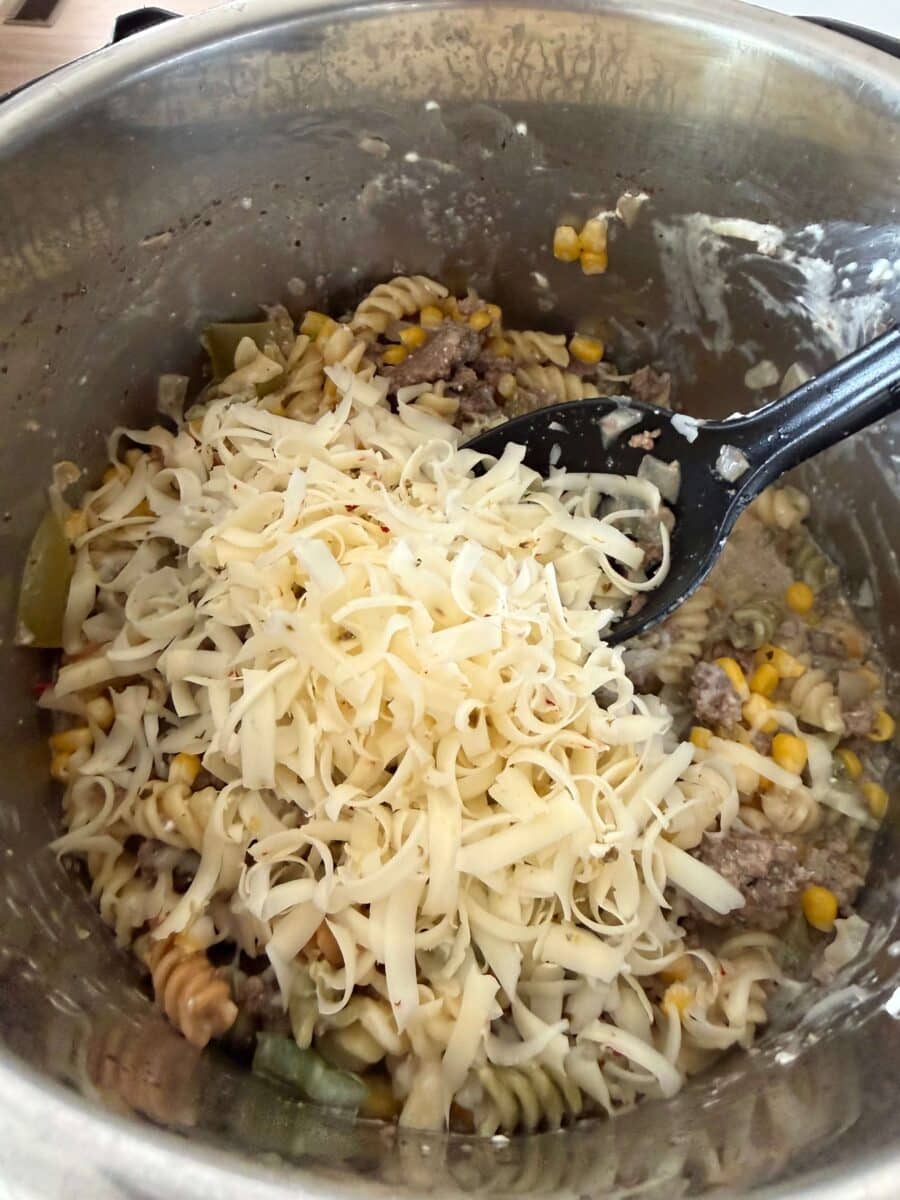 An easy Instant Pot dinner with ground beef, rotini, corn, ranch dressing mix and melty pepper jack cheese.