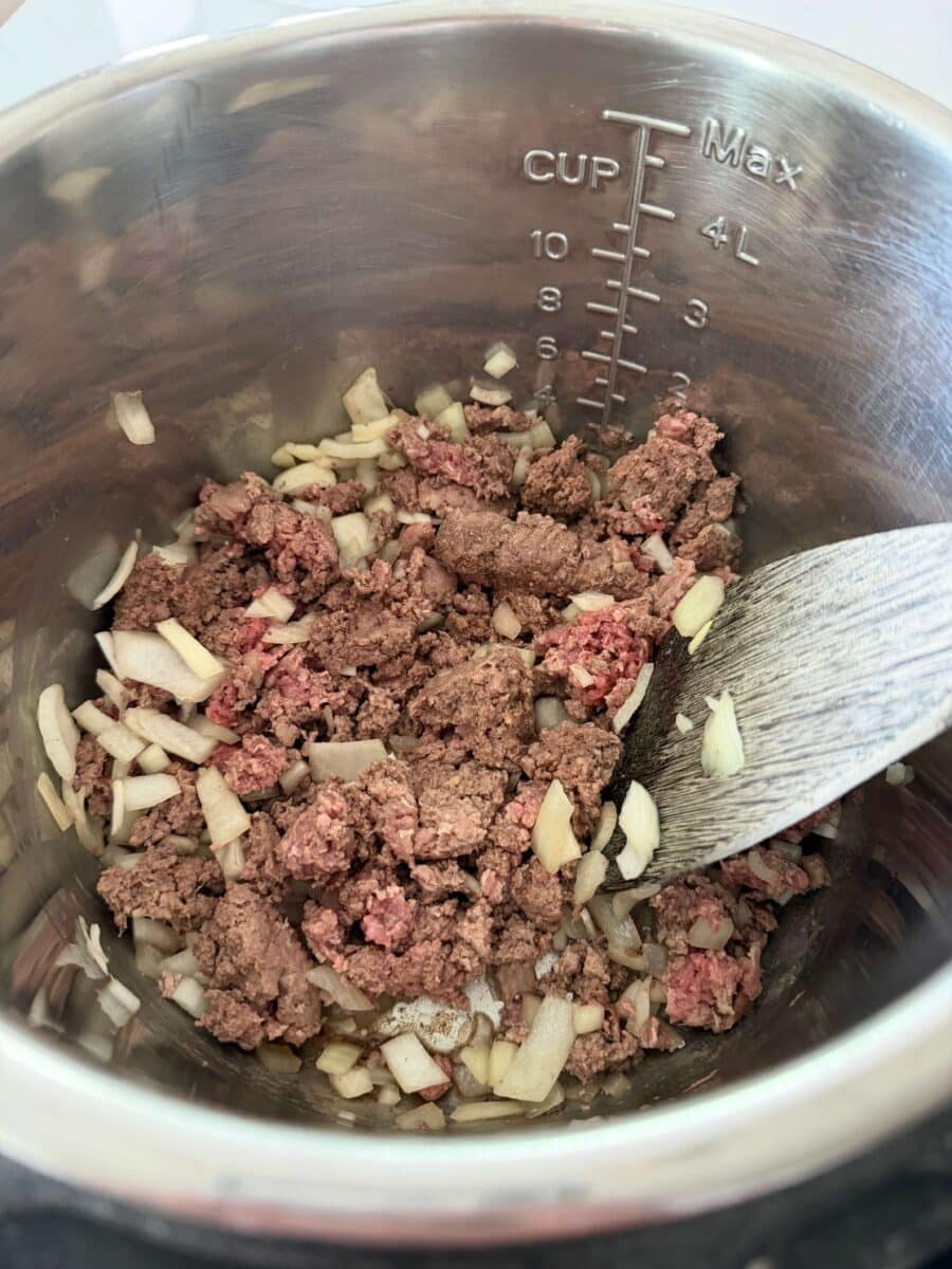 - Turn Instant Pot to saute setting. When display says HOT add in the beef and break it up. Add in the onion. Brown for 5 minutes. Drain off excess grease. Stir in the salt, pepper, garlic powder and onion powder.