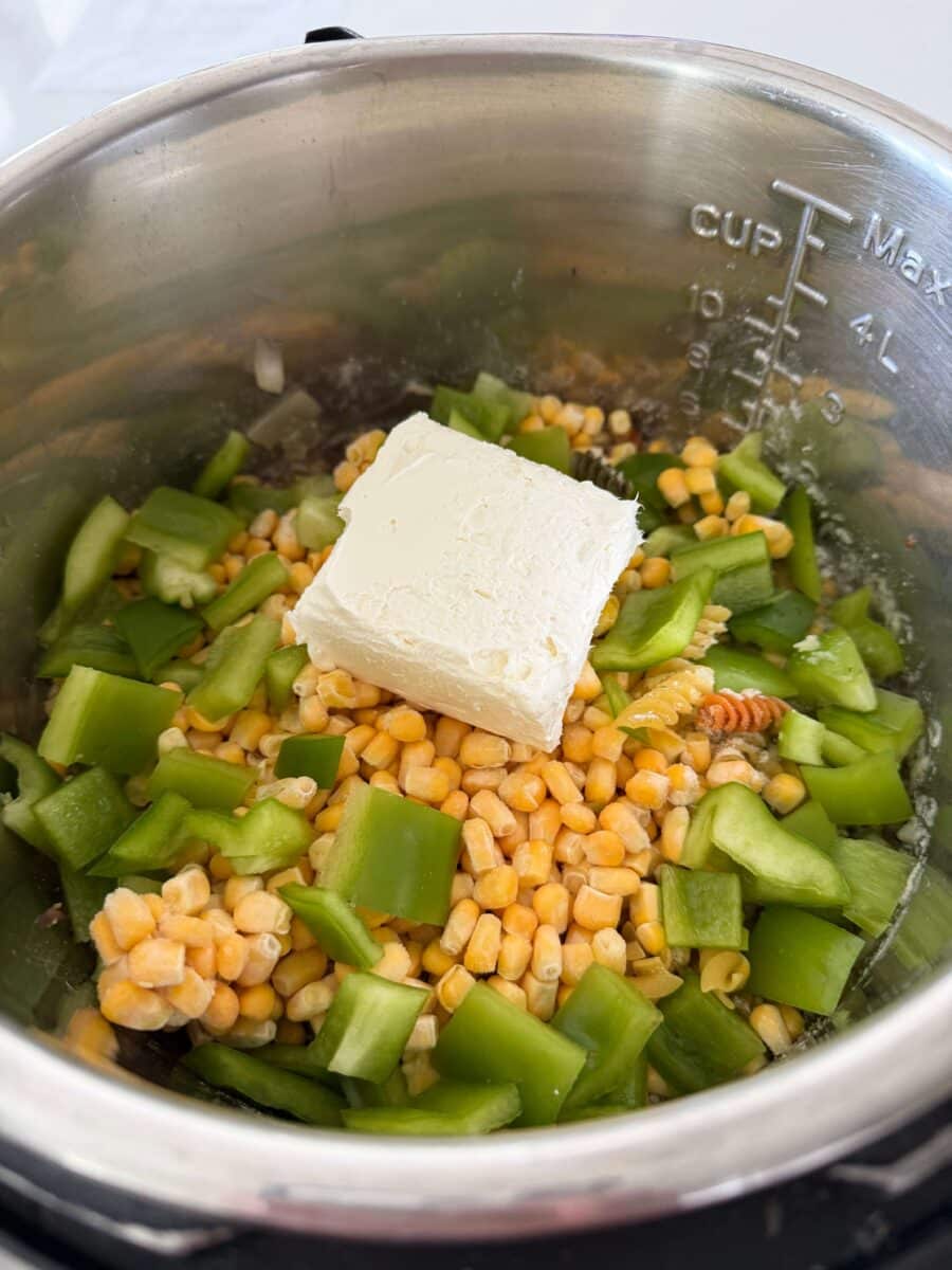- Sprinkle in the rotini and sprinkle the ranch dressing mix on top. Dump in the cream cheese, corn and the bell pepper.