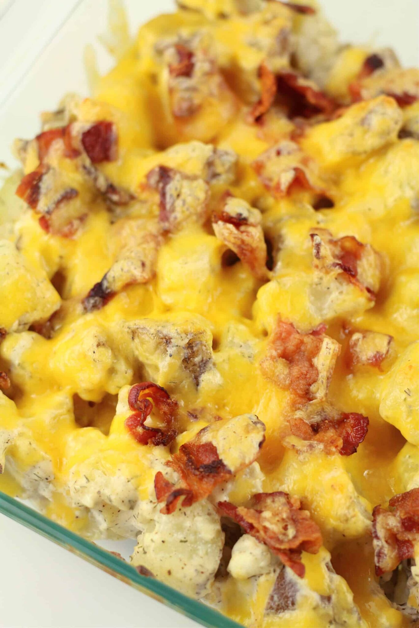 Spread ¼ cup of the cheese sauce into the bottom of a 9×9 inch baking dish. Add in half of the potatoes. Spread half of the remaining cheese sauce over the potatoes. Sprinkle half of the remaining cheddar on top. Then repeat the layers (rest of the potatoes, cheese sauce and cheddar).