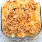 Grandma Grace’s Casserole–tender cubed potatoes are layered with a creamy homemade cheese sauce and topped with buttery Ritz crackers for the ultimate comfort food side dish.