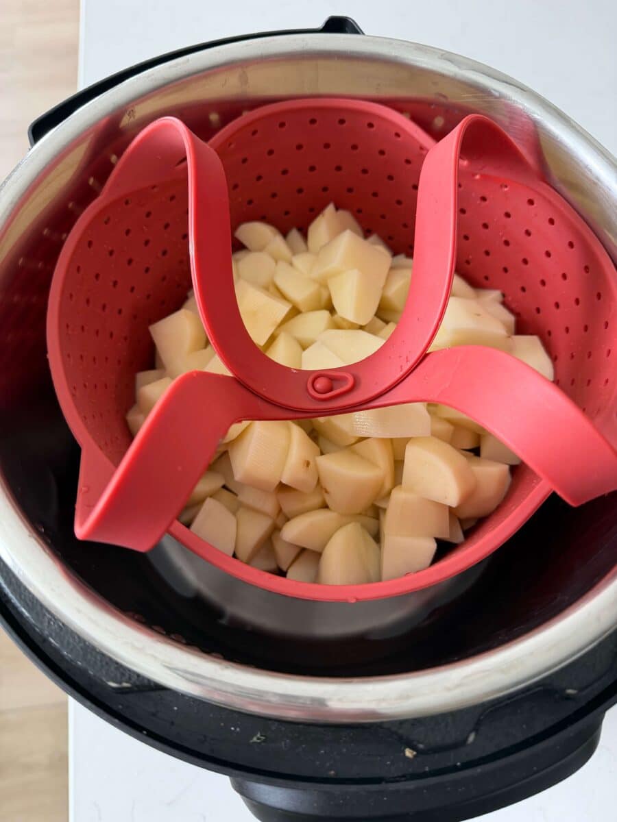 - I used my 6 quart Instant Pot* and my silicone steamer basket* to cook the potatoes. You can also cook the potatoes on the stove. Boil the potatoes until they are barely tender.
