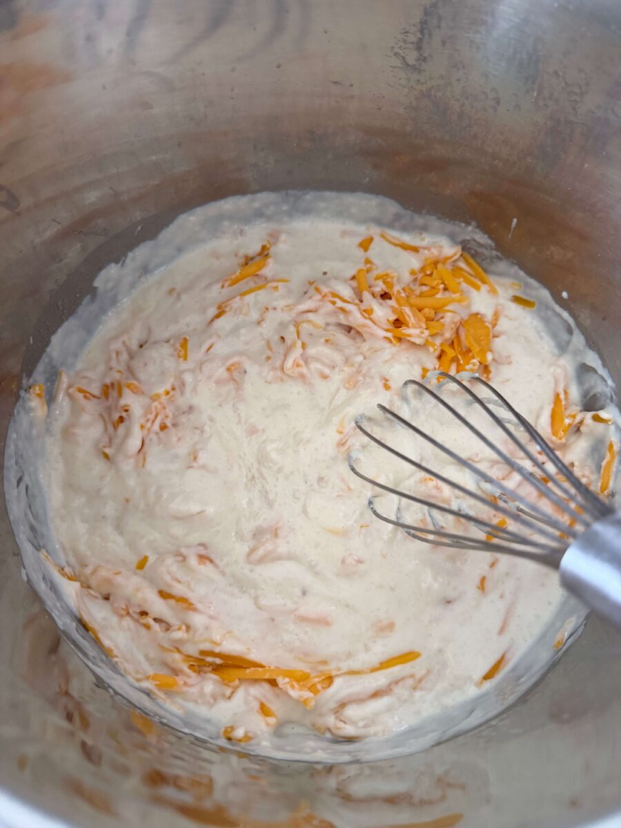 Slowly whisk in the half and half. Stir in the salt. Cook, whisking until the mixture thickens. Turn off Instant Pot and then stir in 1 ¼ cups of the cheddar (about 5 oz) until it is melted. Move pot off of burner if needed so the cheese sauce doesn’t burn.