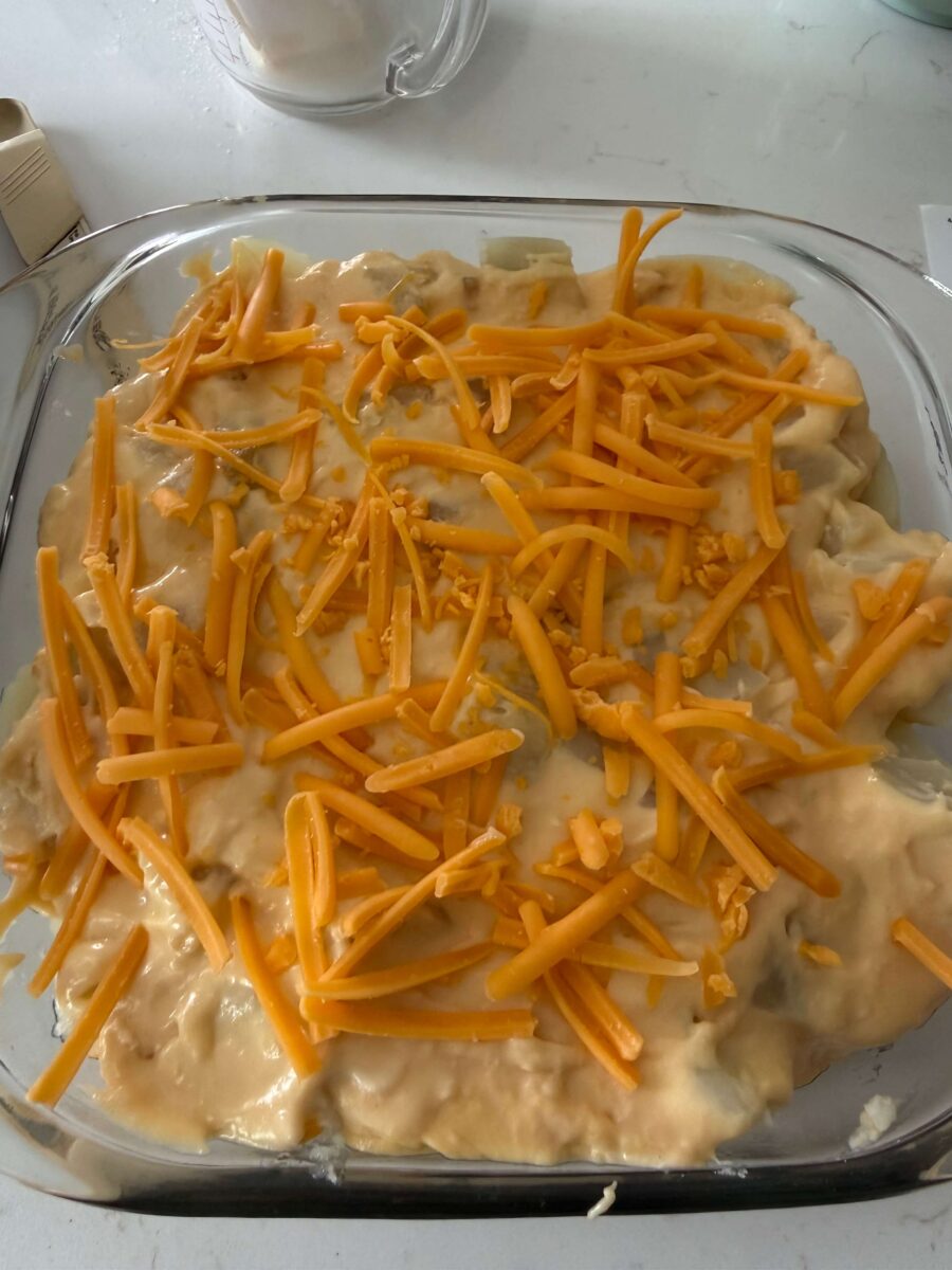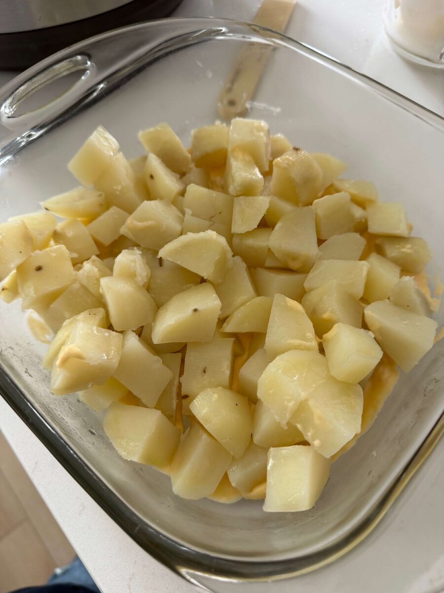 - Spread ¼ cup of the cheese sauce into the bottom of a 9×9 inch baking dish. Add in half of the potatoes. Spread half of the remaining cheese sauce over the potatoes. Sprinkle half of the remaining cheddar on top. Then repeat the layers (rest of the potatoes, cheese sauce and cheddar).