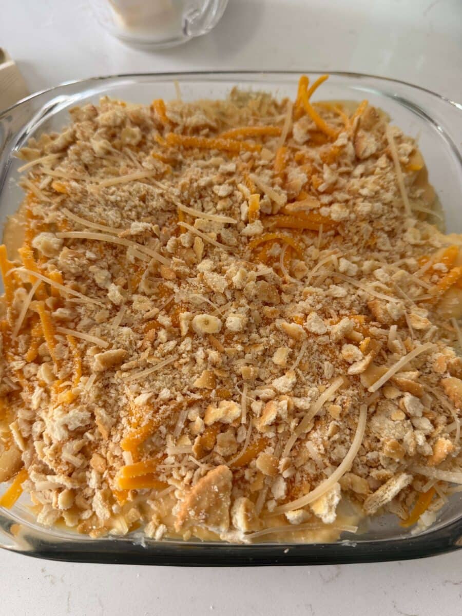 - Crush the Ritz crackers and stir together with parmesan cheese. Spoon the mixture over the top of the casserole.