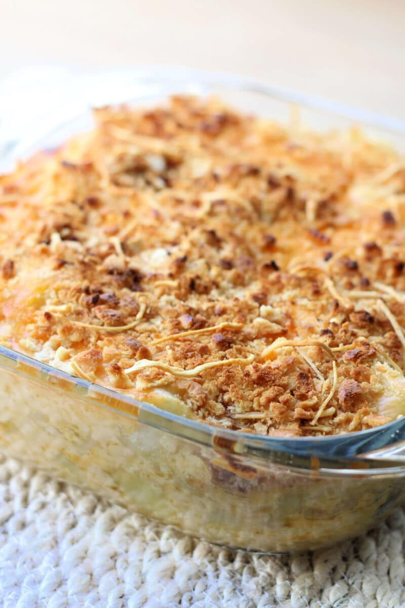 Tender cubed potatoes are layered with a creamy homemade cheese sauce and topped with buttery Ritz crackers for the ultimate comfort food side dish.
