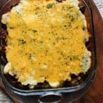 Spread half of the potatoes in the bottom of a 8×8 inch baking dish. Then spread the meat mixture on the top. Spread the remaining potatoes on top and sprinkle with cheese.