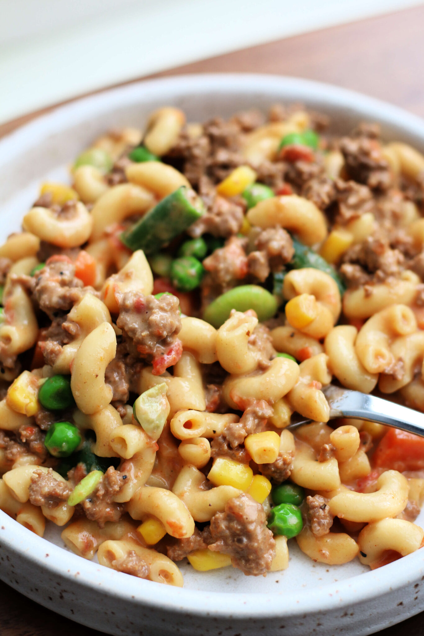 An Instant Pot ground beef and macaroni dish that is cheesy and comes together fast with pantry staples and frozen veggies.