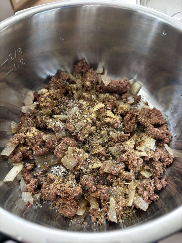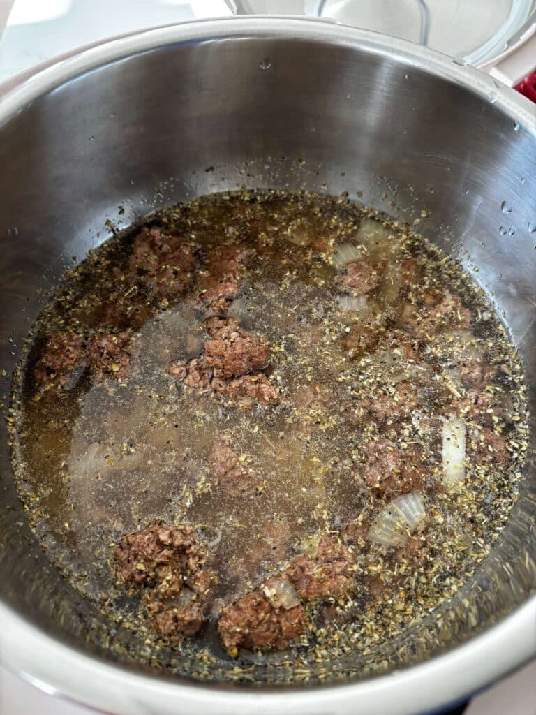 - Turn Instant Pot to sauté setting. When display says HOT add in the beef and break it up. Add in the onions. Brown for 5 minutes. Drain off excess grease. Stir in the salt, pepper, garlic powder, Italian seasoning and Worcestershire sauce.