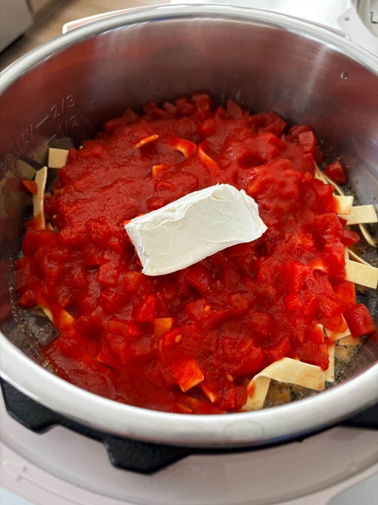 Layer the noodles on top. Dump the tomatoes and tomato sauce evenly over the noodles. Add in the cream cheese.