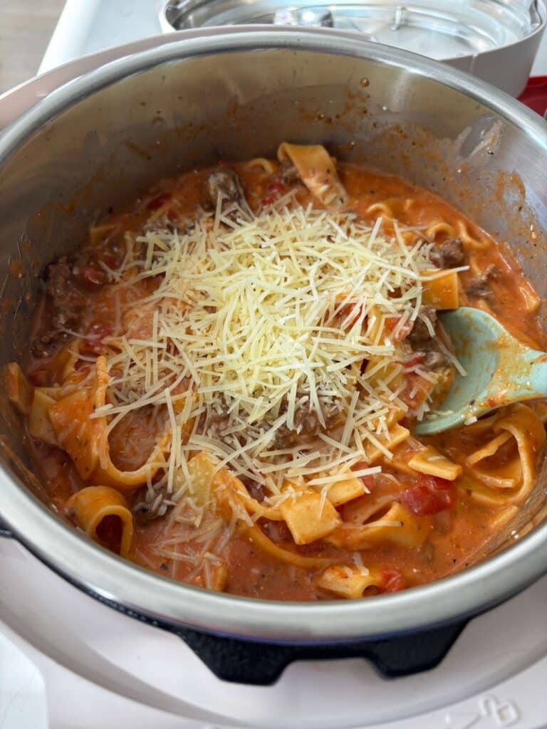An easy Instant Pot dinner made with ground beef, noodles, tomatoes, and a parmesan finish.