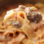 An Instant Pot spaghetti dish with tender ground beef, savory mushrooms, cabbage, tangy tomatoes and creamy cheeses for a comforting one-pot meal.