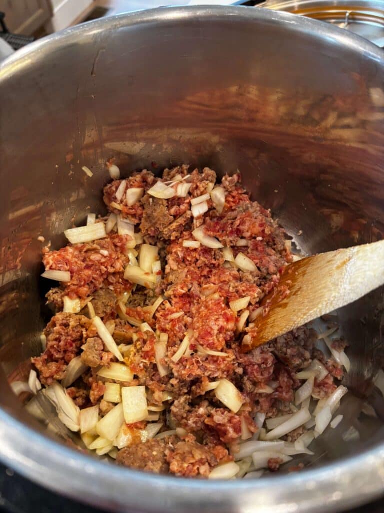 Turn Instant Pot to sauté setting. When display says HOT add in the ground sausage and break it up. Add in the onions. Brown for 5 minutes. Stir in the smoked sausage.