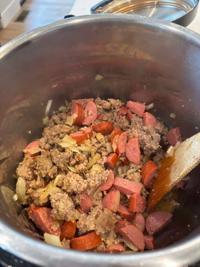 - Turn Instant Pot to sauté setting. When display says HOT add in the ground sausage and break it up. Add in the onions. Brown for 5 minutes. Stir in the smoked sausage.