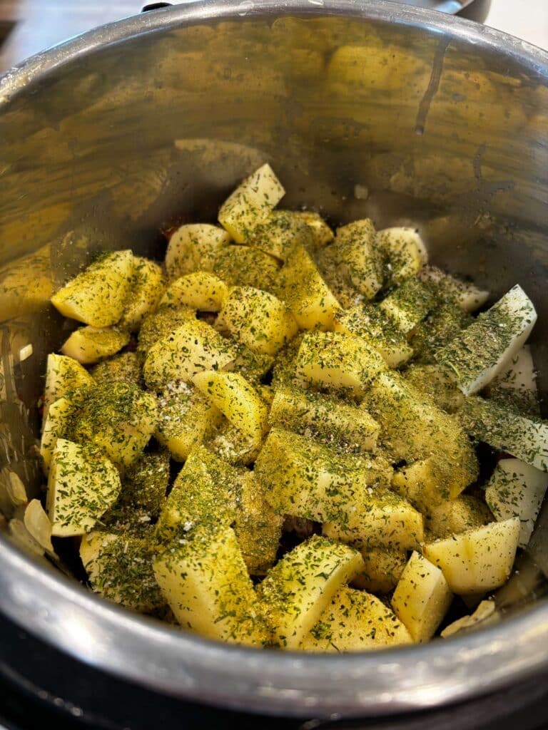 Peel the potatoes and cut into 1 inch pieces. Add them evenly into the Instant Pot.