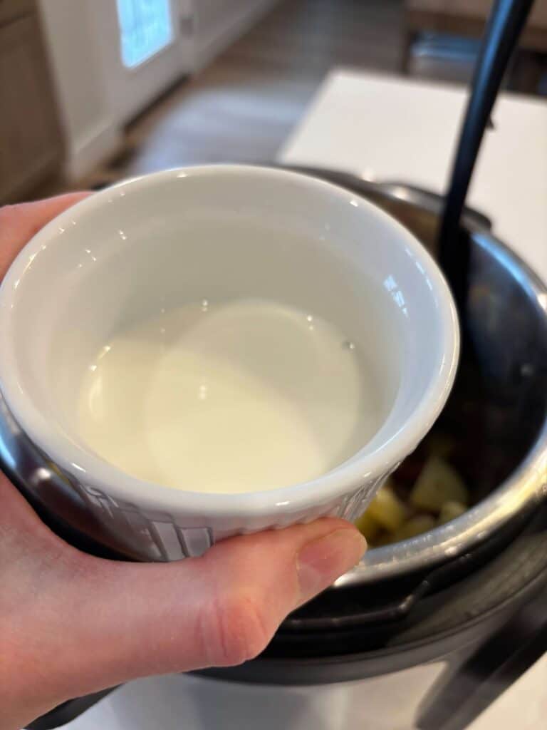 - If desired, make a cornstarch slurry. Stir together 1 Tbsp of cornstarch with 1 Tbsp of water. Turn Instant Pot to sauté setting. Stir the slurry into the pot to thicken the sauce. Once thickened turn off Instant Pot.