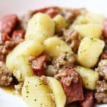 A sausage and potato dinner made with browned ground sausage, smoked sausage slices, tender potatoes and simple seasonings. It’s all cooked together in the Instant Pot or slow cooker and finished off with a light gravy that pulls everything together.