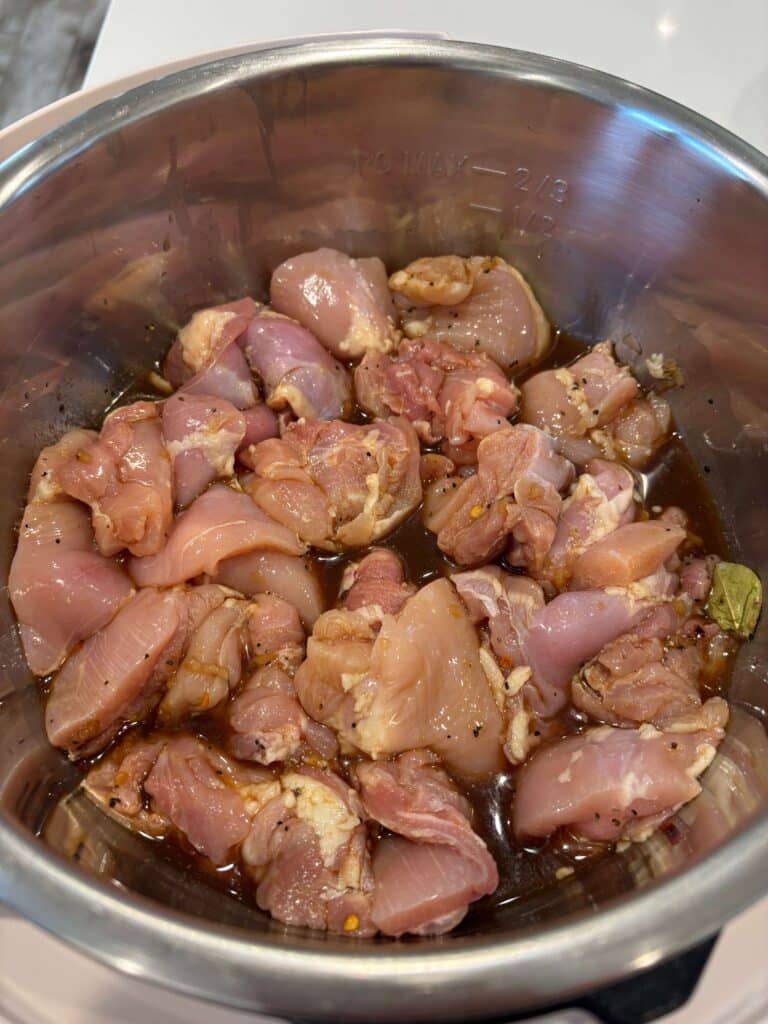 - Meanwhile, cut the chicken into chunks (I cut each thigh into 4-5 pieces). Add chicken, garlic, pepper, ginger, bay leaf and red pepper into the Instant Pot.
