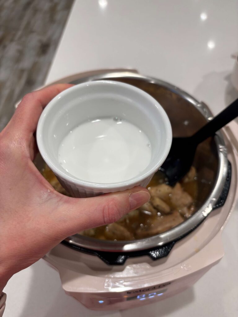 - Stir the chicken. If you’d like to thicken the sauce you can make a cornstarch slurry by combining 2 Tbsp cornstarch with 2 Tbsp water and stirring until smooth. Stir the mixture into the pot on the sauté setting. Sauce will thicken fairly quickly. Turn off Instant Pot.