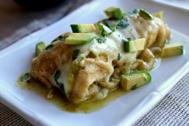Smothered Green Sauce Enchiladas–homemade Cafe Rio style mild tomatillo sauce is simmered in your electric pressure cooker along with chicken breasts to create the base of your enchiladas.
