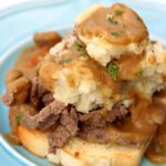 Slices of seasoned top round roast piled on white toast and then topped with a scoop of creamy mashed potatoes and drizzled with caramelized onion gravy.