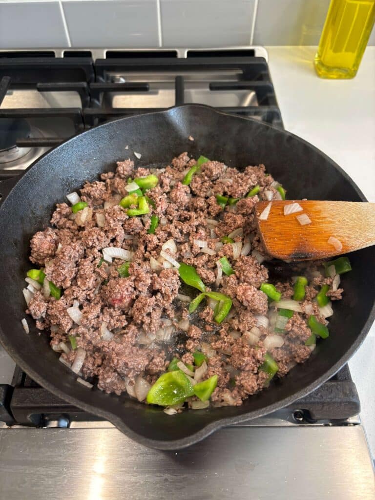 - Heat an oven safe skillet (I used my cast iron skillet*) over medium high heat. Add in the beef and break it up. Add in the onions and green pepper. Brown for 5 minutes. Drain off excess grease.