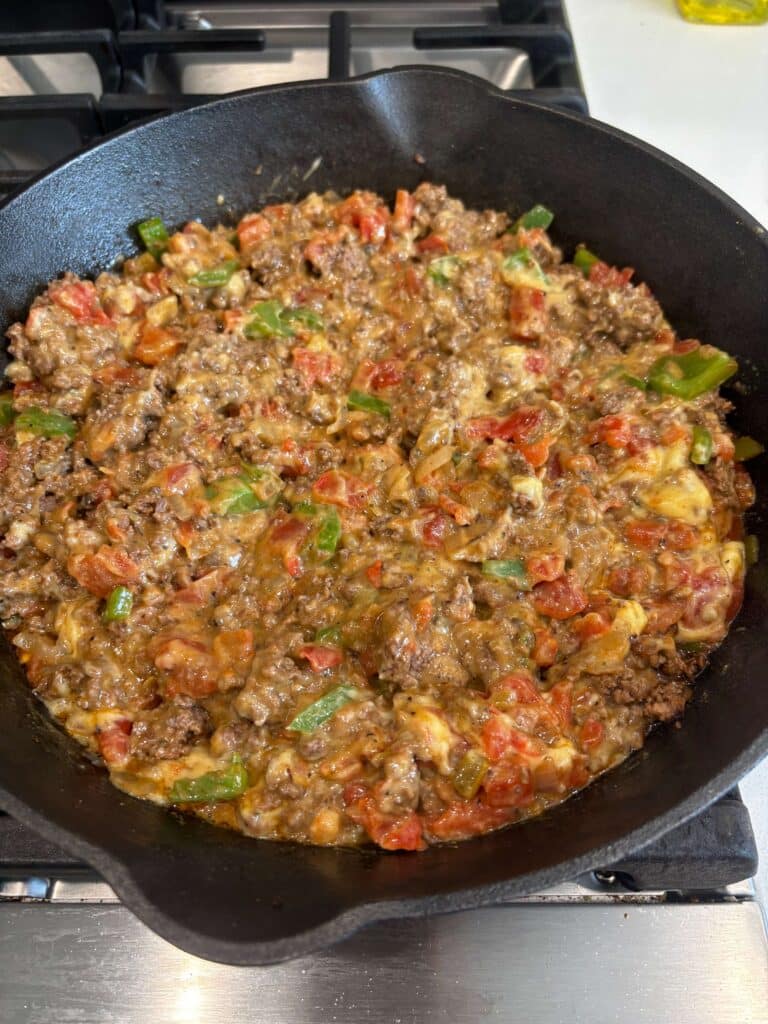 Heat oven to 350° F. Heat an oven safe skillet (I used my cast iron skillet*) over medium high heat. Add in the beef and break it up. Add in the onions and green pepper. Brown for 5 minutes. Drain off excess grease.